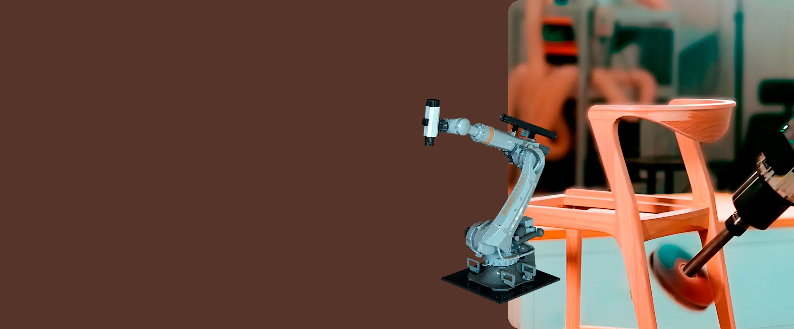 Robôs industriais de 6 eixos com área de trabalho de até 20m, capazes de usinar componentes em madeira e derivados com alta precisão, mantendo consistência mesmo em peças de maior porte.